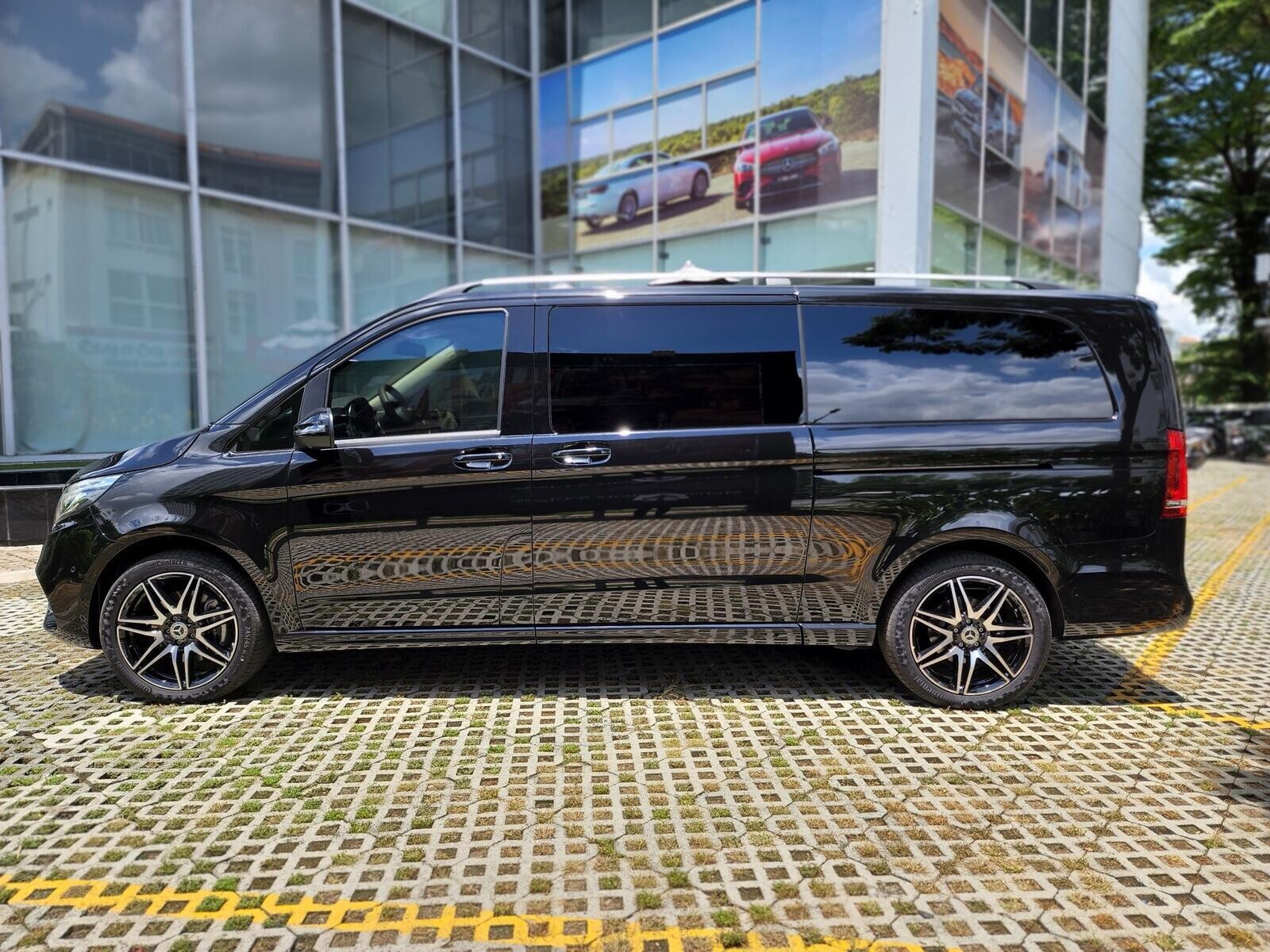 Chiêm ngưỡng từ hai bên, Mercedes V250 AMG 2025 nổi bật với 2 đường gân dập nổi kéo dài từ vòm bánh trước đến cụm đèn hậu. Bộ mâm 19 inch 7 chấu kép đặc trưng càng làm cho thân xe năng động, đậm tinh thần thể thao.
